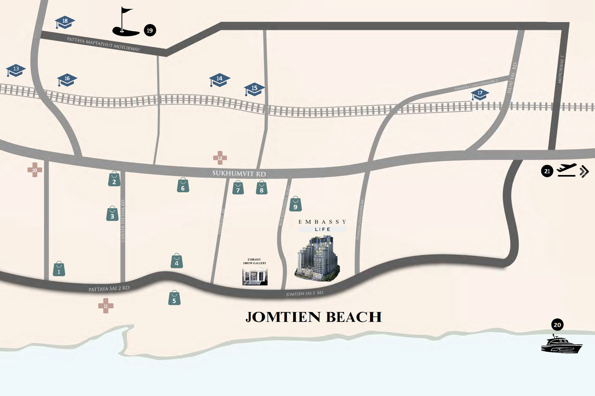 Embassy LIFE is a 24-story luxury condominiom, just 500 meters from Jomtien Beach. Set on over 7 rai of prime land, it blends timeless elegance with wellness-inspired design, creating a sanctuary for both body and mind. Perfectly located on Jomtien Second Road, the area offers both tranquility and connectivity. Residents can enjoy morning runs along the vibrant beach road, a favorite route for locals and visitors alike. With the upcoming Pattaya Monorail approved by City Hall - set to be completed within five years and stopping just steps from the project - traveling from the airport to Pattaya and Jomtien will be faster and easier than ever. Surrounded by premium shopping, international schools and high-class hospitals, Embassy LIFE offers the ideal combination of convenience, lifestyle and future-ready infrastructure.